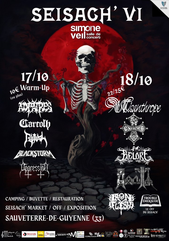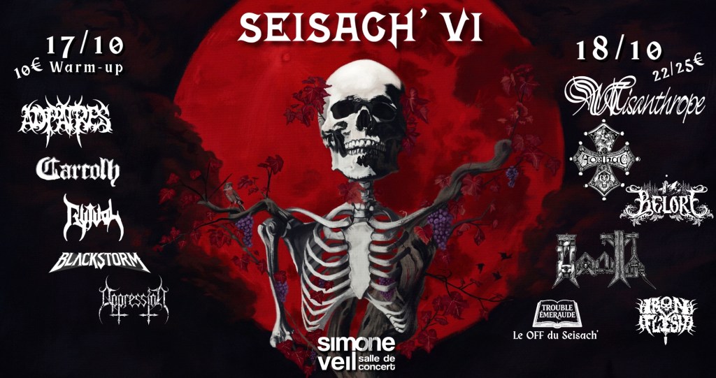 L’association Musiques en Bastide et Seisachtheion sont fiers de vous présenter la 6e édition de la SEISACH’, qui se déroulera à nouveau sur deux jours, les vendredi 17 et samedi 18 octobre 2025, à la Salle Simone Veil. Nous aurons à cœur de promouvoir une nouvelle fois le Metal extrême hexagonal (Black/Death/Doom/Thrash), avec à la fois des références de la scène nationale (rarement de passage dans la région), des valeurs fortes et reconnues, ainsi que des forces vives de notre région. Ces dernières seront d’ailleurs mises à l’honneur lors de notre warm-up.