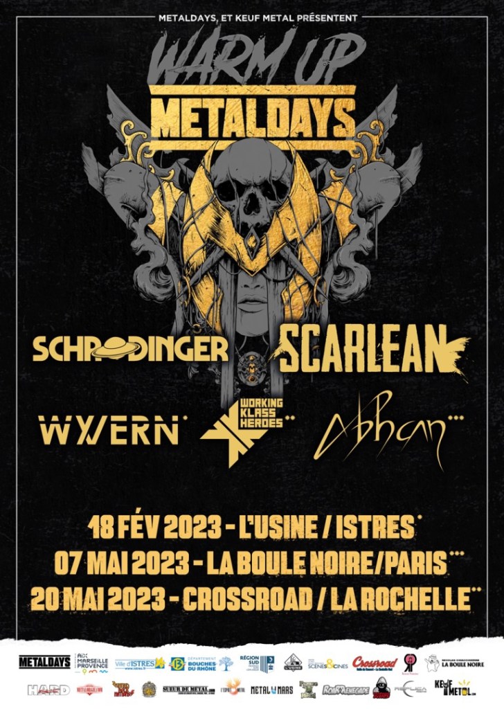 Au programme de ces Warm Up : des concerts, des pass pour le MetalDays à acheter sur place, mais aussi à gagner ! SCARLEAN, SCHRODINGER et leurs amis vous donnent rendez-vous à Istres (13), Paris (75) et La Rochelle (17) l’année prochaine pour des soirées métalliques à souhait et une fêter d’enfer !