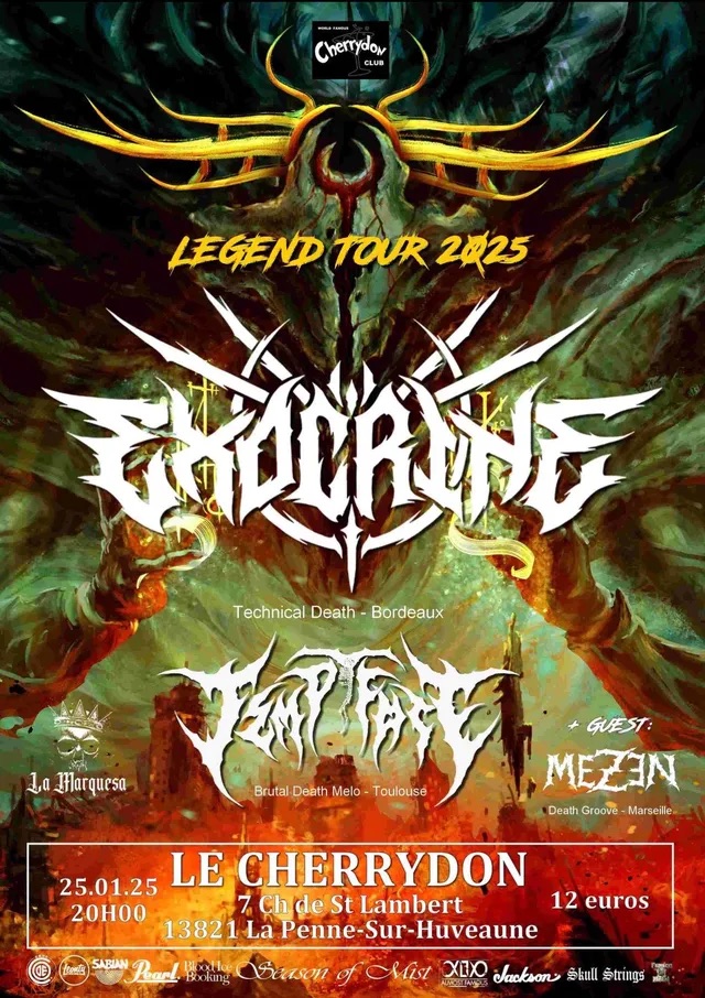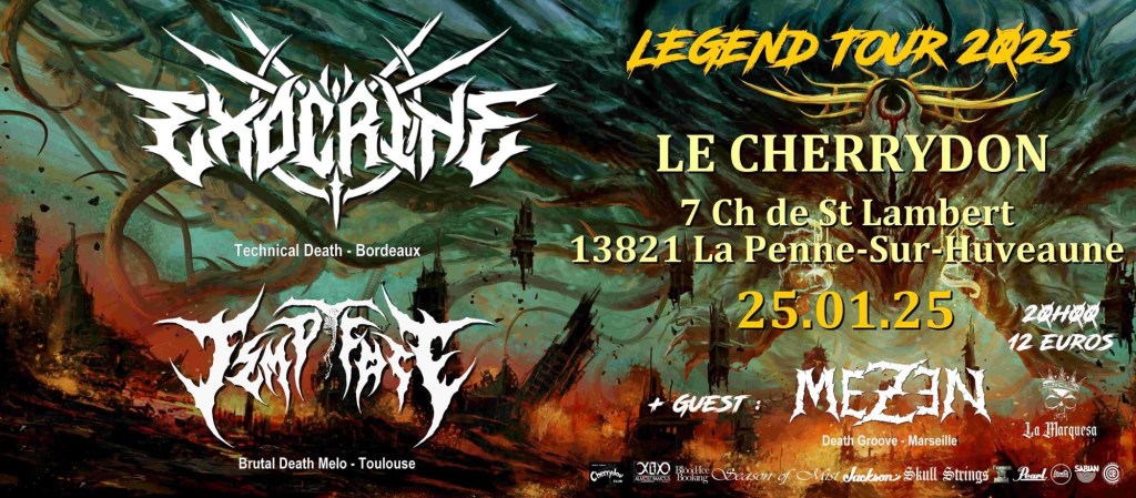 Avec la sortie du premier album du groupe bordelais EXOCRINE, « Unreal Existence », en 2015, le groupe s’est frayé un chemin dans le monde du death metal technique. La sortie de « The Hybrid Suns » en 2022 est le cinquième album de leur carrière, un concept album qui étudie le voyage entre la vie et la mort, et qui met en valeur un niveau de musicalité époustouflant. Continuant à repousser les limites de l’extrême et de la précision, Exocrine est le pont entre la férocité d’ARCHSPIRE et de CRYPTOPSY, et les puissantes tendances progressives de THE FACELESS. Leur 6ème album « Legend » est sorti en 2024 via Season of Mist.